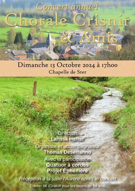 Dimanche 13 Oct. À 17h à la chapelle de Ster, Concert d’automne de la Chorale « CRISNIR » de Ster ! Avec la participation du Quatuor à cordes « Projet Ephémère. Entrée 8 € à partir de 14 ans. Réception à la salle l’Aurore après le concert.