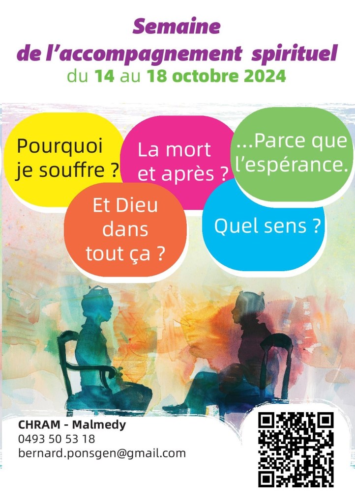 du 14 au 18 octobre 2024, le Vicariat de la Santé propose une Semaine de l’accompagnement spirituel en milieu hospitalier. Le Vicariat de la Santé du diocèse de Liège a implémenté cette « semaine de l’accompagnement spirituel » pour sensibiliser les acteurs de la santé mais aussi le public – les chrétiens et les autres – à cette dimension importante du soin (le « care ») qui s’adresse à tout l’humain. Elle se déroule en particulier dans tous les hôpitaux, cliniques… où des équipes d’aumônerie sont actives. Renseignement et outils sur le site du Vicariat de la Santé. Si cet accompagnement vous parle et que vous êtes intéressés à vous former pour vivre ce service avec d’autres, contactez l’abbé B.Ponsgen, aumônier de la clinique Reine Astrid de Malmedy.