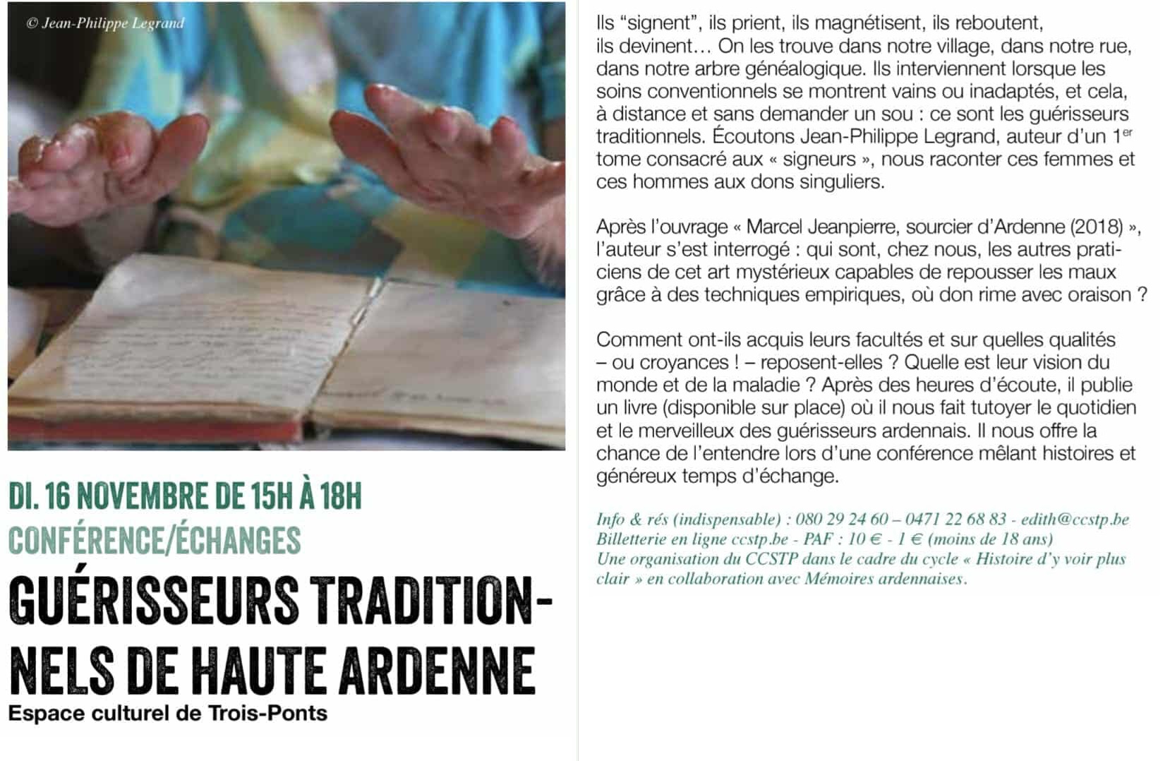 Voici le lien pour réserver : https://www.ccstp.be/agenda/guerisseurs-traditionnels-de-haute-ardenne/ . Notez qu’elle aura encore lieu le 10/12 à Malmedy (asbl Option) à 15h et à 19h.