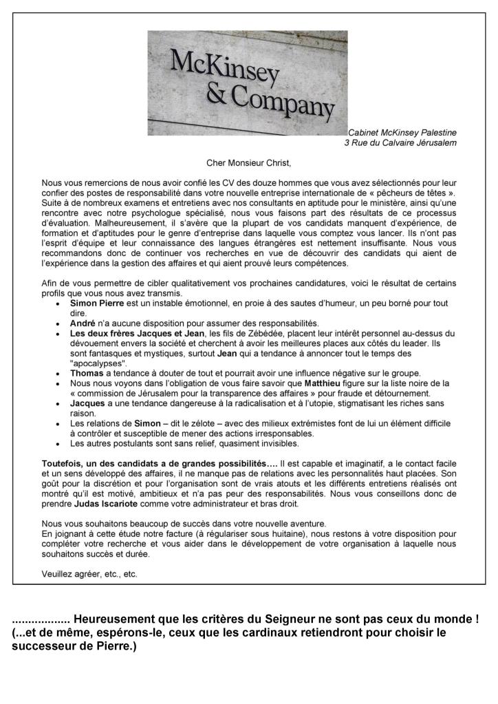 On raconte que Jésus s’interrogeait beaucoup sur le choix de ses associés les plus proches au début de son ministère public. Pour en avoir le cœur net, il demanda à un célèbre cabinet-conseil de la capitale, expert en management, une étude sur l’équipe qu’il avait constituée. Voici la réponse qu’il a reçue :