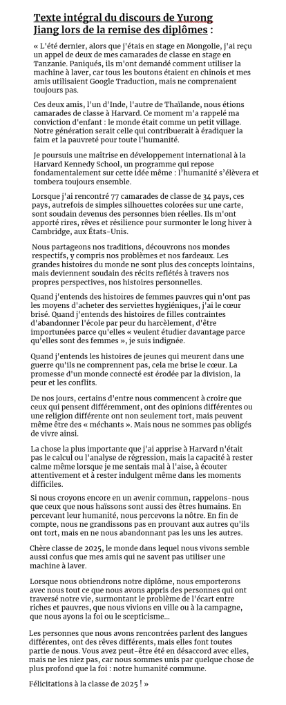 Le discours émouvant de Yurong Jiang continue de se propager sur les réseaux sociaux en raison de son contenu chaleureux et touchant, mais aussi en raison de la polémique née des intentions de Donald Trump d’exclure les étudiants étrangers des universités américaines, en particulier à Harvard.